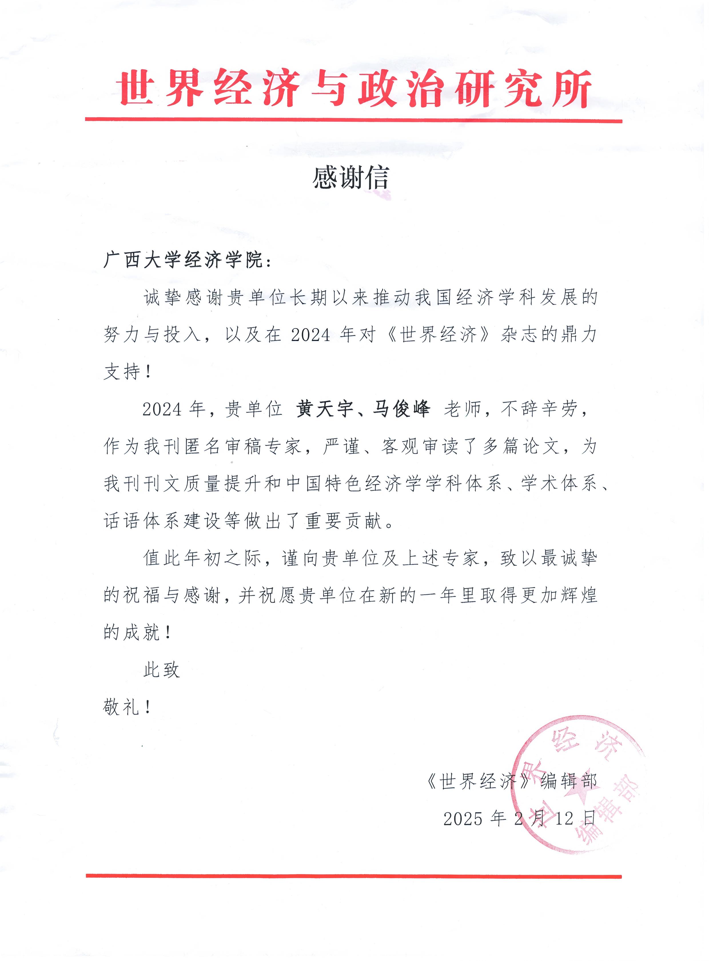 近日,世界经济与政治研究所《世界经济》编辑部向我院发来感谢信,感谢我院在2024年对《世界经济》杂志的鼎力支持,对我院教师黄天宇、马俊峰担任该刊匿名审稿专家期间的卓越贡献表示感谢。作为审稿人,他们以严谨的学术态度、深厚的专业素养和客观公正的评审标准,审读了多篇学术论文,为杂志的刊文质量提升做出了重要贡献,为中国特色经济学学科体系、学术体系、话语体系建设提供了有力支持。