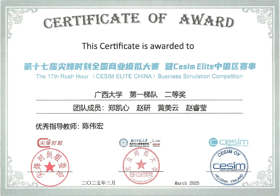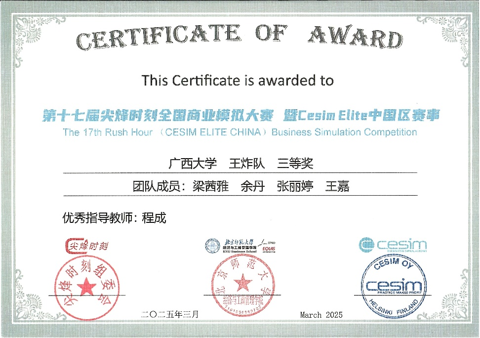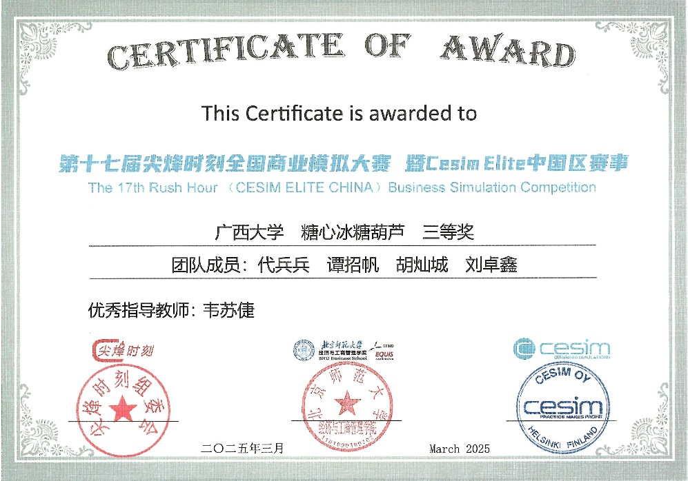 2025年3月28日至30日,第十七届“尖烽时刻”全国商业模拟大赛总决赛暨Cesim Elite中国区赛事在北京师范大学隆重举行。经历初赛、复赛的激烈角逐,我院陈伟宏、张伟豪老师指导的学生团队从170余所高校的2000余支队伍脱颖而出,研究生组“第一梯队”和本科生组“战狼队”成功晋级全国总决赛。最终,我院代表队在本届比赛中斩获全国二等奖2项、全国三等奖3项、优秀指导教师2名。