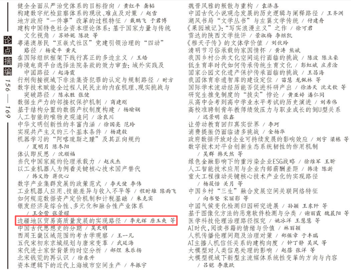 近日,我院李光辉教授、唐玉爽助理教授以及澳大利亚新南威尔士大学硕士研究生杨宛谕在《南开学报》(哲学社会科学版)2025年第2期发表的论文入选《新华文摘》2025年第13期论点摘编,摘编标题为《边疆地区贸易高质量发展的实现路径》。