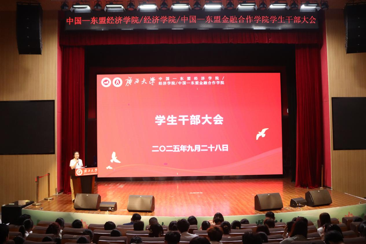 9月28日,中国—东盟bat365中文官网登录入口在大学生活动中心小剧场隆重举行2025年秋季学期学生干部大会。学院党委副书记刘梦娟、团委书记王海希及学工组辅导员老师出席,各学生组织骨干与班级代表共200余人参会,共同见证新老交接、凝聚共识的重要时刻。