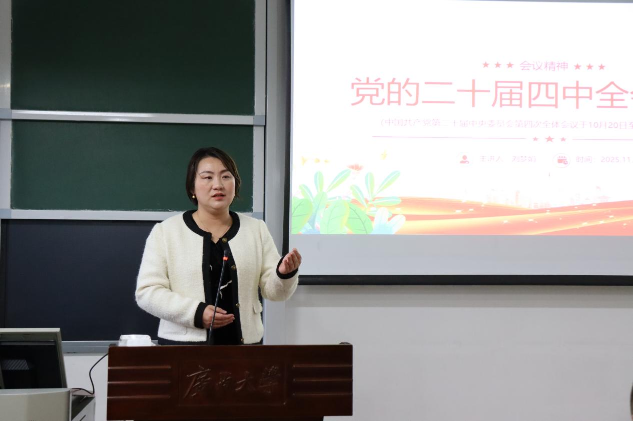 会上,院党委副书记刘梦娟围绕党的二十届四中全会精神为学生干部讲授党课。她系统介绍了历届党的四中全会的定位和内涵,重点解读“十五五”时期经济社会发展需要把握的“六个必须坚持”,为学生干部开展班级政治学习活动提供明确指导。她强调,学生干部要深刻领会党的二十届四中全会精神,以高度的政治责任感和使命感,引领同学们坚定理想信念,增强“四个意识”、坚定“四个自信”、做到“两个维护”。