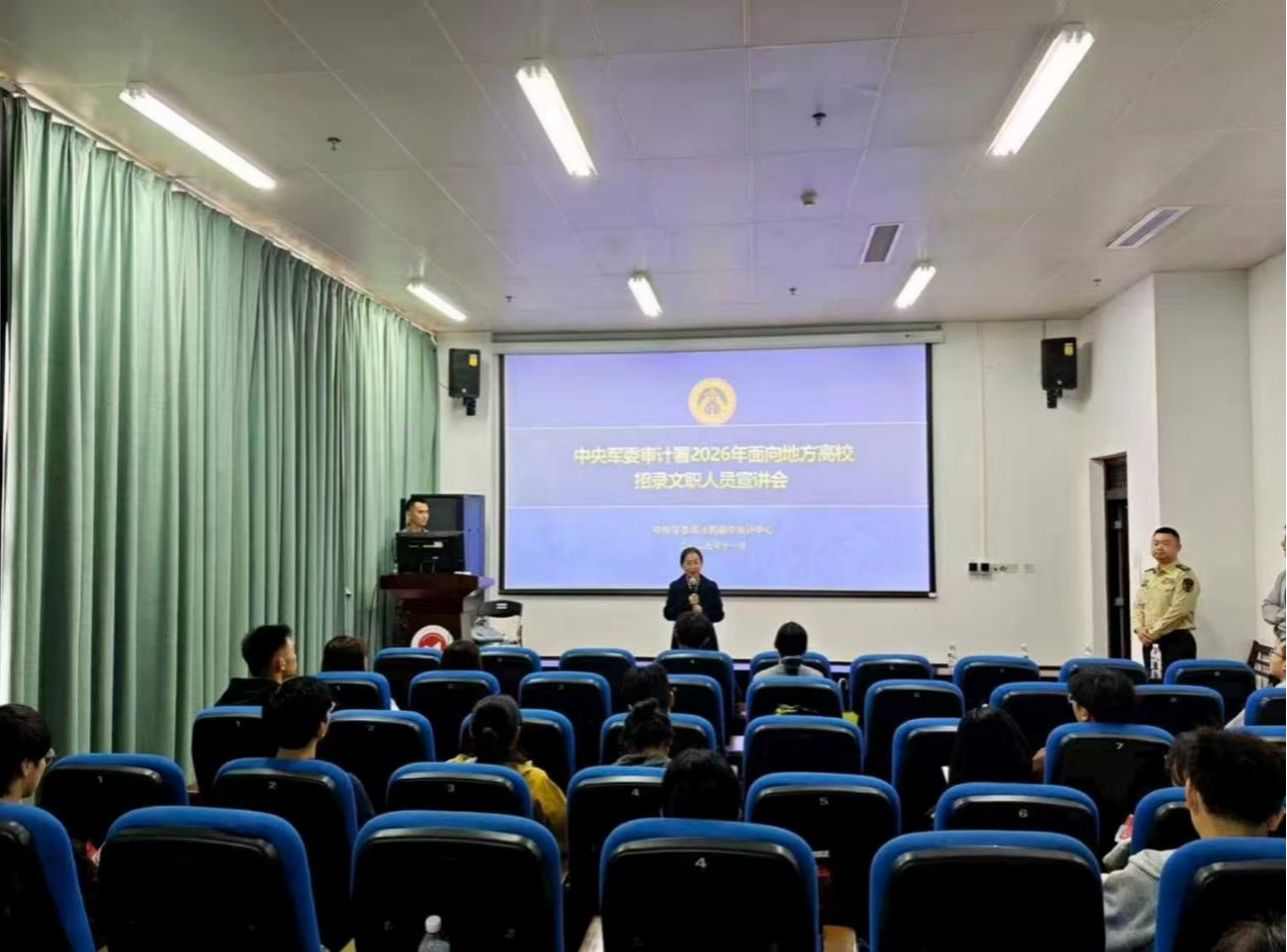 为积极响应新时代人才强军战略,服务国防和军队现代化建设,激发青年学子投身强军事业的报国热情,11月4日下午,中央军委审计署南宁审计中心一行来到我院,成功举办2026年面向地方高校招录文职人员宣讲会。此次活动不仅为同学们深入了解军队文职搭建了重要平台,更架起了一座连接个人理想与国家需要的桥梁。