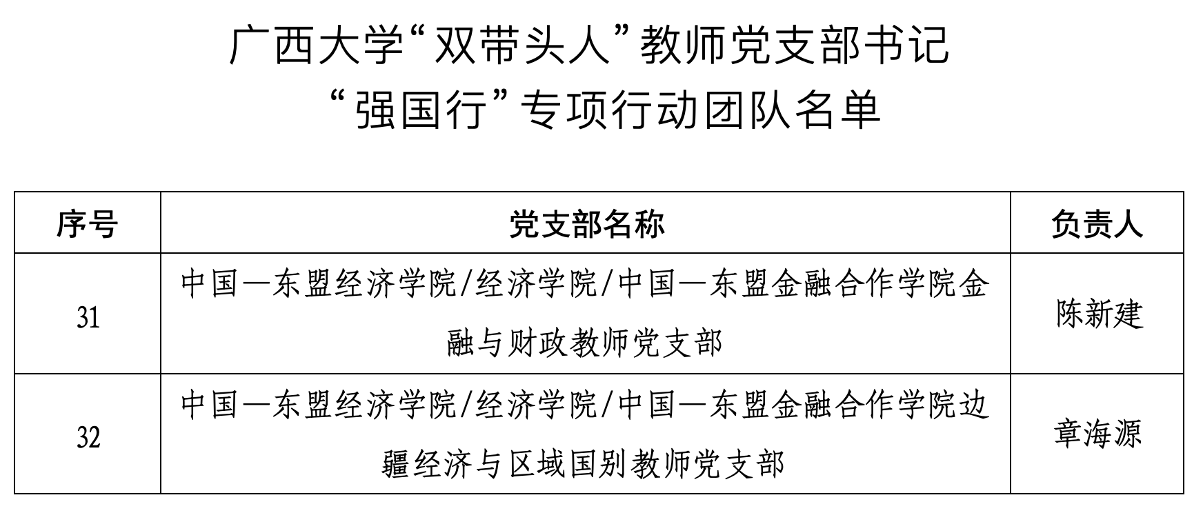 2025年11月12日,我校党委组织部公布了我校“双带头人”教师党支部书记“强国行”专项行动团队名单,我院陈新建教授担任负责人的金融与财政教师党支部与章海源教授担任负责人的边疆经济与区域国别教师党支部成功入选。