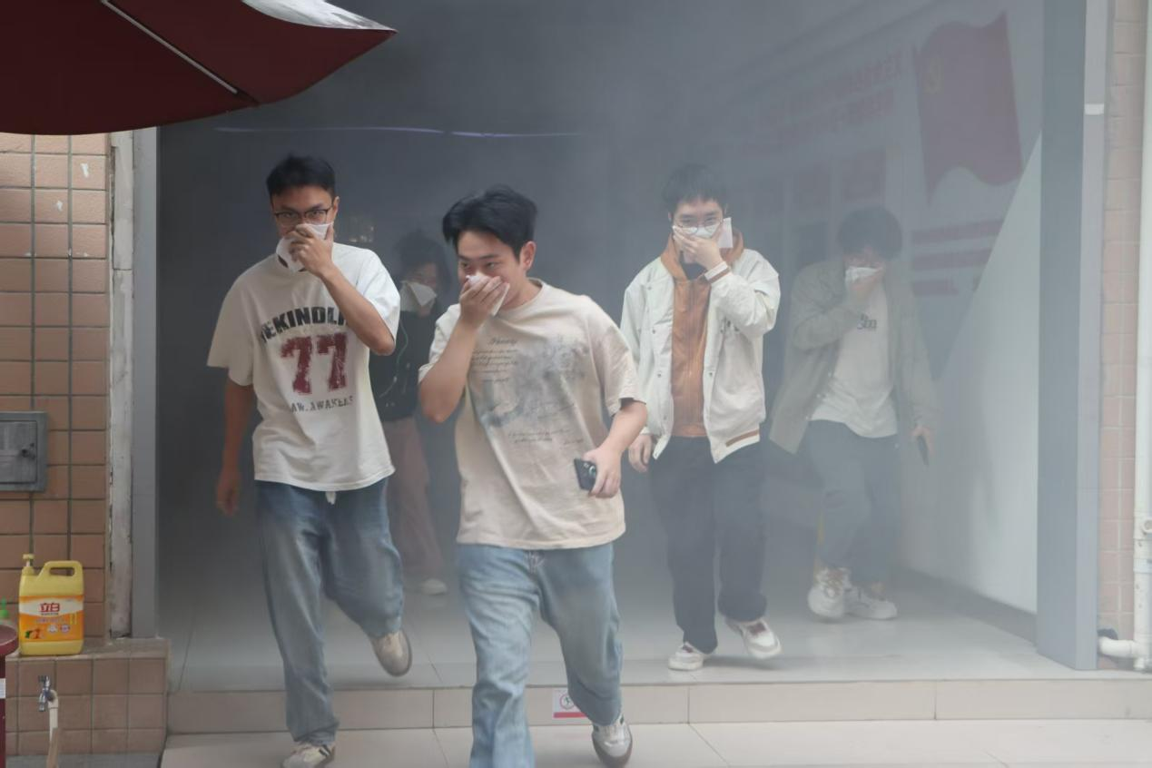 随后进入疏散演练环节。负责人模拟火灾发生后,楼内烟雾渐起的场景,师生迅速反应,用湿毛巾捂住口鼻,在引导人员的指挥下,保持低姿态,沿疏散通道有序、快速撤离至室外安全集结点。