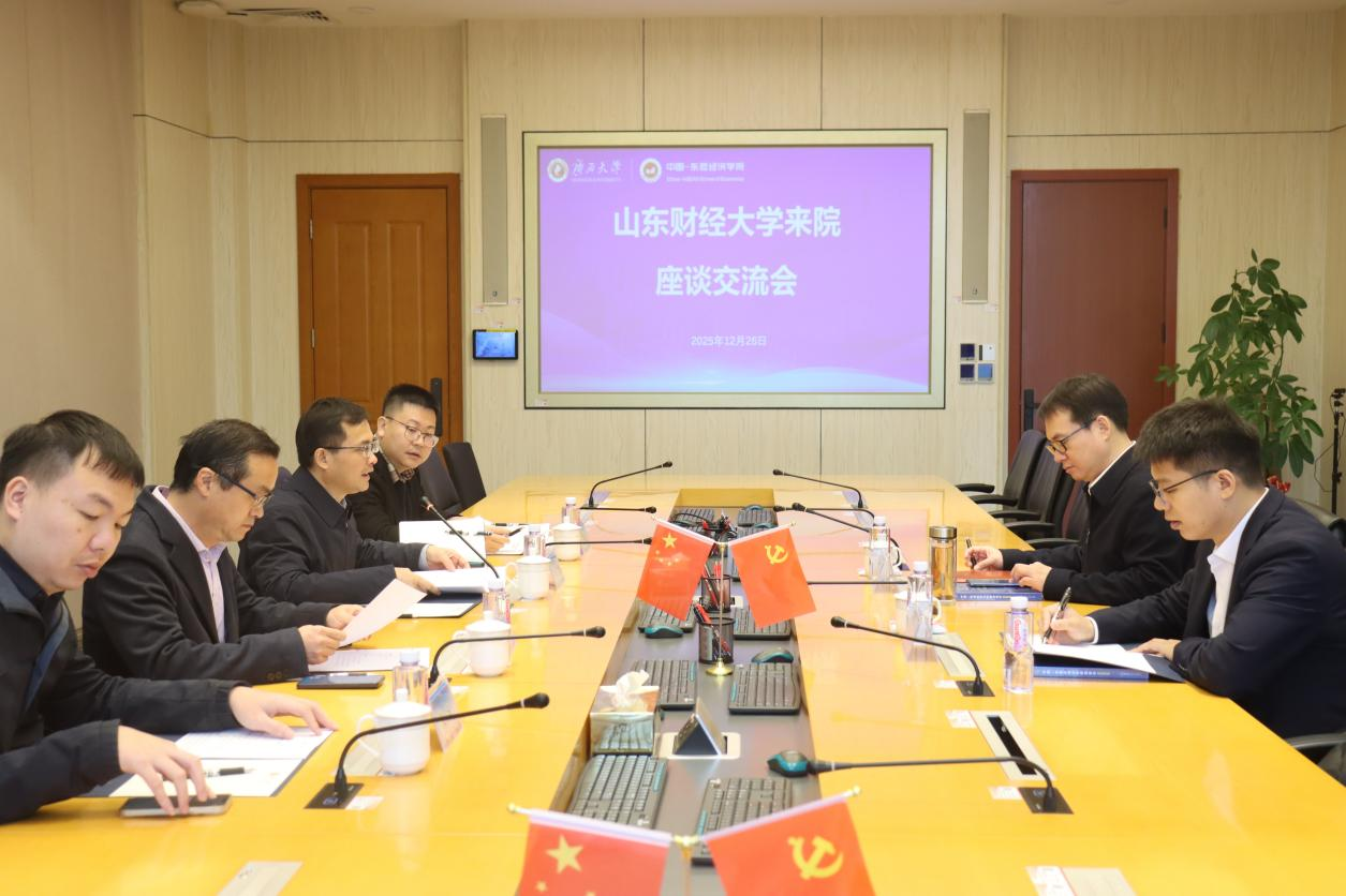 12月26日上午,山东财经大学党委副书记、校长洪俊杰到我院调研,并开展座谈交流会。会议由我校中国—东盟研究院执行院长、bat365中文官网登录入口常务副院长梁运文主持。双方围绕学科规划、特色发展、人才培养,以及面向中国—东盟区域的学院特色建设、学术研究及学术合作等方面展开了深入交流。