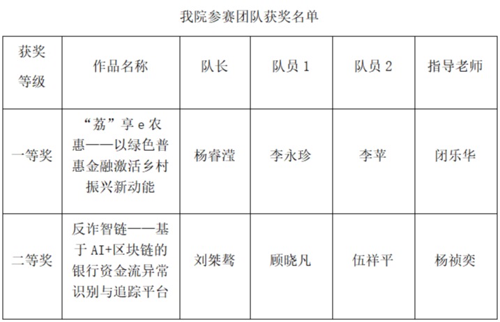 在激烈的现场路演与答辩环节,我院学子凭借扎实的专业功底和出色的现场表现脱颖而出。最终,由闭乐华老师指导,杨睿滢、李永珍、李苹组成的团队凭借作品《“荔”享e农惠——以绿色普惠金融激活乡村振兴新动能》荣获赛区一等奖;由杨祯奕老师指导,刘桀骜、顾晓凡、伍祥平组成的团队凭借作品《反诈智链——基于AI+区块链的银行资金流异常识别与追踪平台》斩获赛区二等奖。