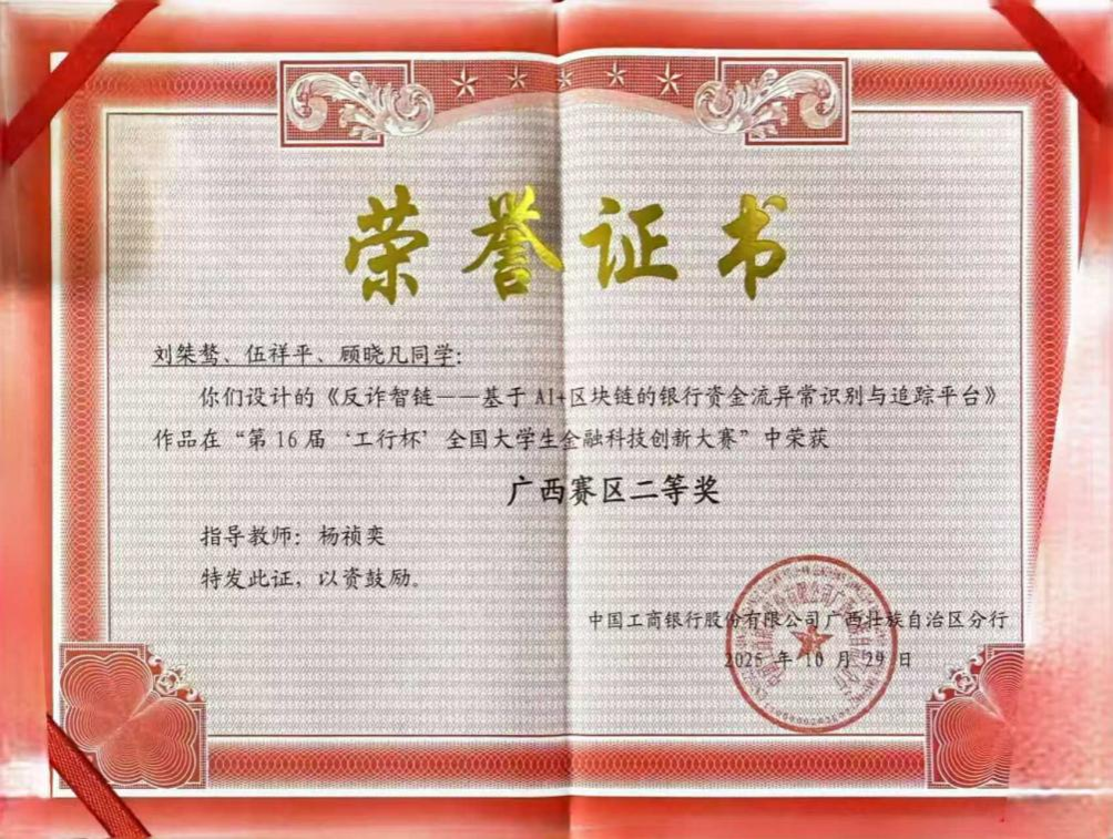 我院“反诈智链”团队荣获第16届‘工行杯’全国大学生全融科技创新大赛广西赛区二等奖